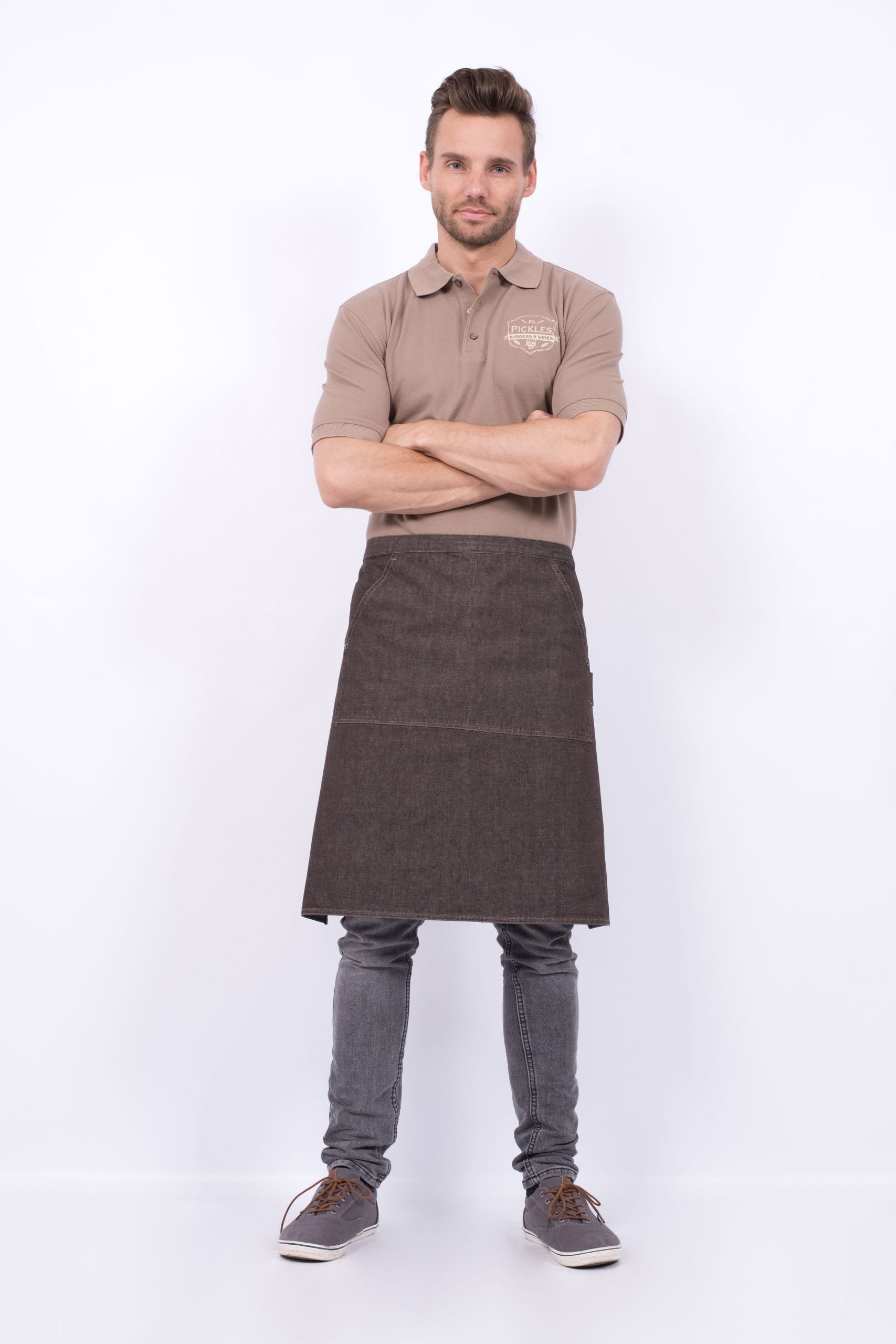 Stoere brown denim sloof 80×60 cm van Chaud Devant met 2 kangaroo zakken middenvoor. Met afneembare strikbanden d.m.v. stoere denim knopen.